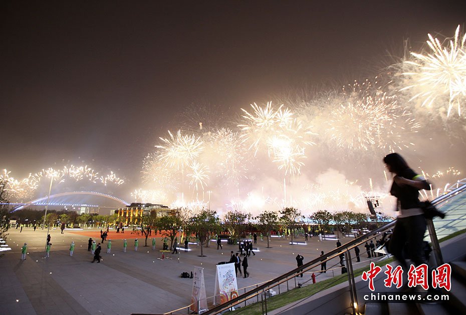 4月30日晚,2010年上海世博会开幕式在上海世博园世博文化中心举行。21时28分,世博会焰火灯光表演开始。黄浦江两岸绵延3.28公里同时奏响火树银花不夜天的华彩世博乐章。图片来源:中国新闻网