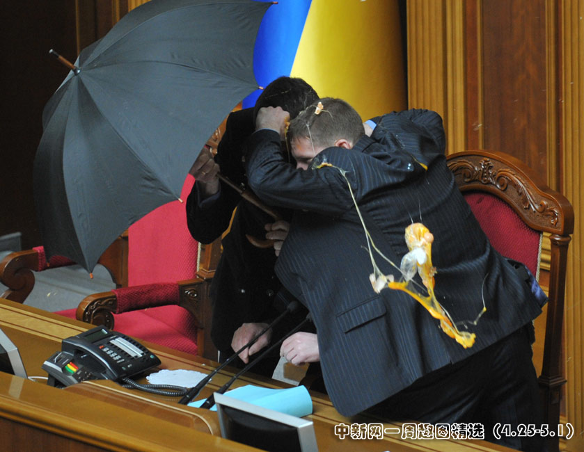 4月27日,基辅,乌克兰议会就俄罗斯黑海舰队驻扎问题进行讨论时出现混乱,数千人在议会外示威,会场内有人投掷烟雾弹和鸡蛋,大厅内烟雾弥漫,场面一度混乱。图片来源:中国新闻网>>点击观看详细内容
