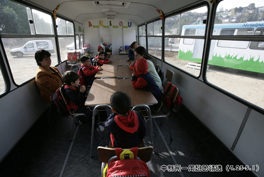 4月26日,今年2月遭受8.8级强烈地震的智利康塞普西翁市,儿童们在“巴士学校”里上课。图片来源:中国新闻网>>点击观看详细内容