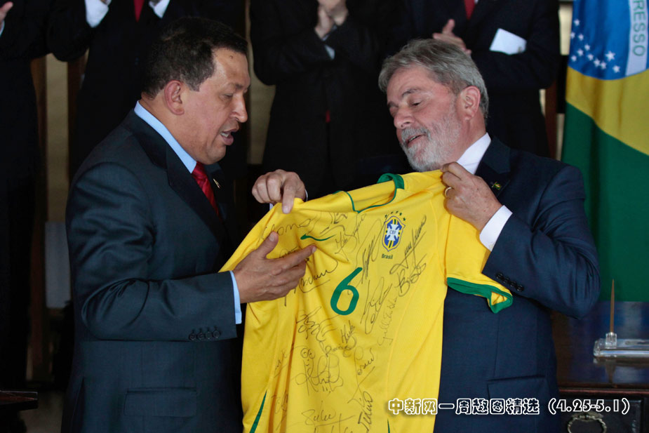 4月28日,巴西总统卢拉在巴西利亚伊塔马拉蒂宫向来访的委内瑞拉总统查韦斯赠送由巴西球星签名的球衣。图片来源:中国新闻网>>点击观看详细内容