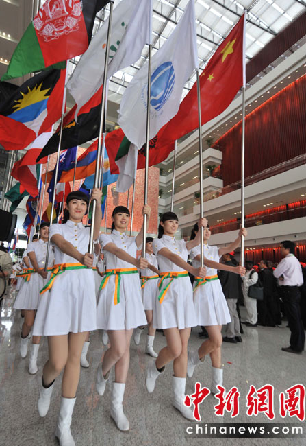 5月1日,上海世博会举行开园仪式,美女旗手高举参展国家和地区、组织的旗帜入场。中新社发 贾国荣 摄