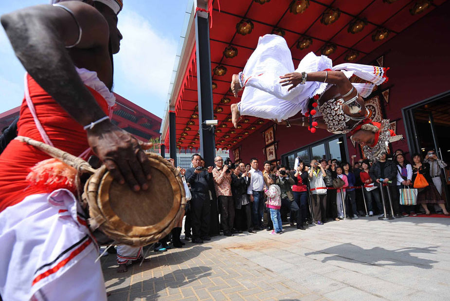 5月1日,上海世博会正式开园迎客,首批游客入园参观。图为斯里兰卡馆门口的舞蹈表演吸引众多参观者驻足观看。 罗晓光 摄