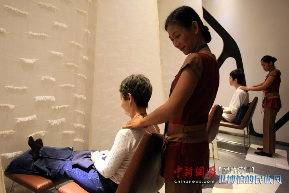 5月1日,上海世博会菲律宾馆开馆,其馆内设置的传统按摩深受参观者欢迎,一早便预约完毕。中新社发 潘索菲 摄