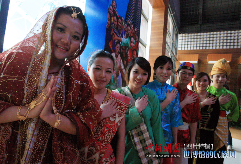 5月1日,上海世博会马来西亚馆开馆,各式亮丽的民族服装成为游客观赏的一道美景。中新社发 潘索菲 摄