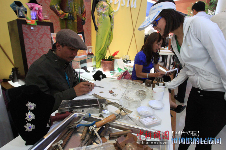 5月1日,上海世博会马来西亚馆开馆,手工艺人用金银丝打造漂亮的胸针,让参观者惊讶不已。中新社发 潘索菲 摄。