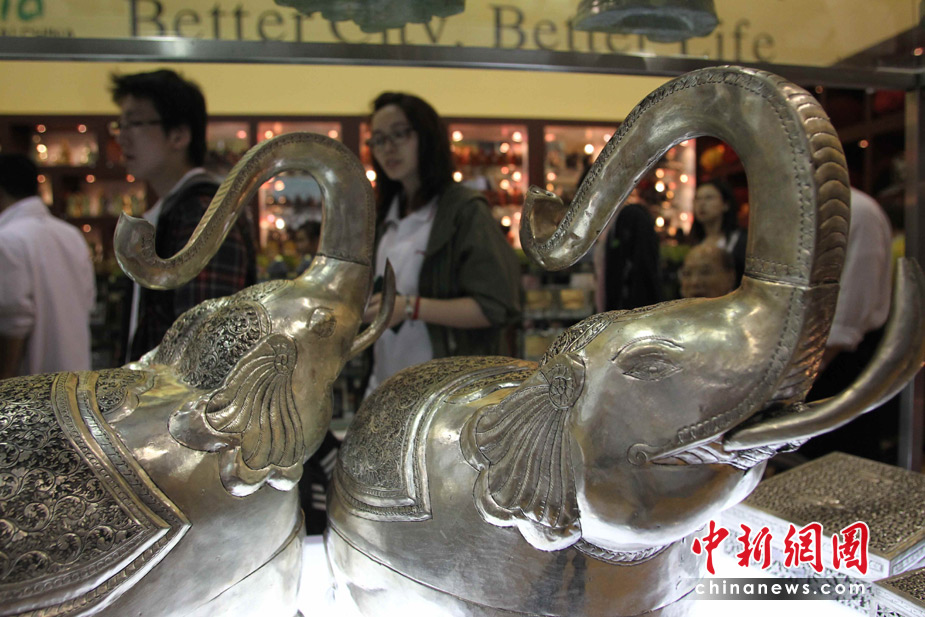 5月1日,观众在世博会柬埔寨馆被精美的银器吸引。中新社发 苏丹 摄