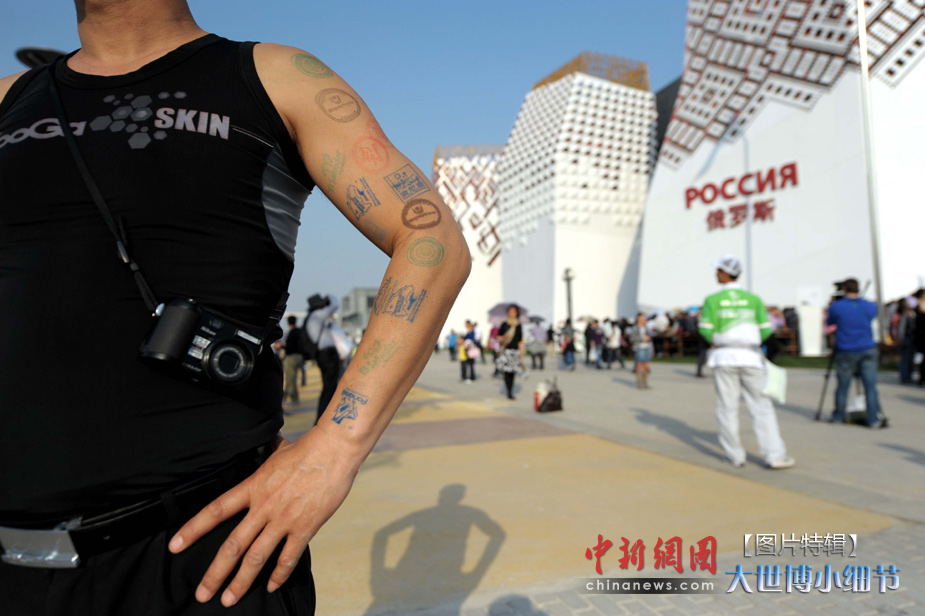 5月1日,上海世博会正式开园,当日有20万人次的游客参观了世博园。世博首日,许许多多的小细节都带给人一种全新的体验。图为一男子胳膊上盖满世博园多个展馆通行纪念印章,收获颇丰。中新社发 陈文 摄