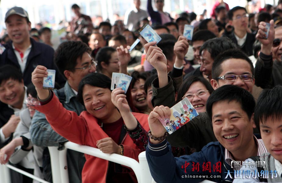 5月1日,上海世博会正式开园,当日有20万人次的游客参观了世博园。世博首日,许许多多的小细节都带给人一种全新的体验。图为首批持票参观者开心地展示参观券。中新社发 袁云 摄