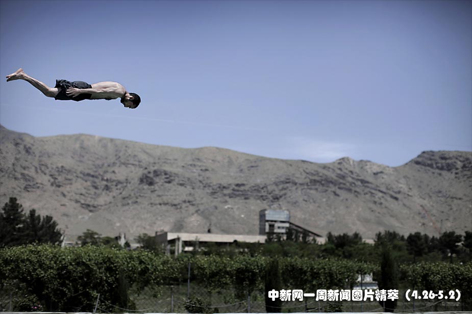 28日(周三),一名阿富汗男子在游泳池上进行跳水,享受阳光。