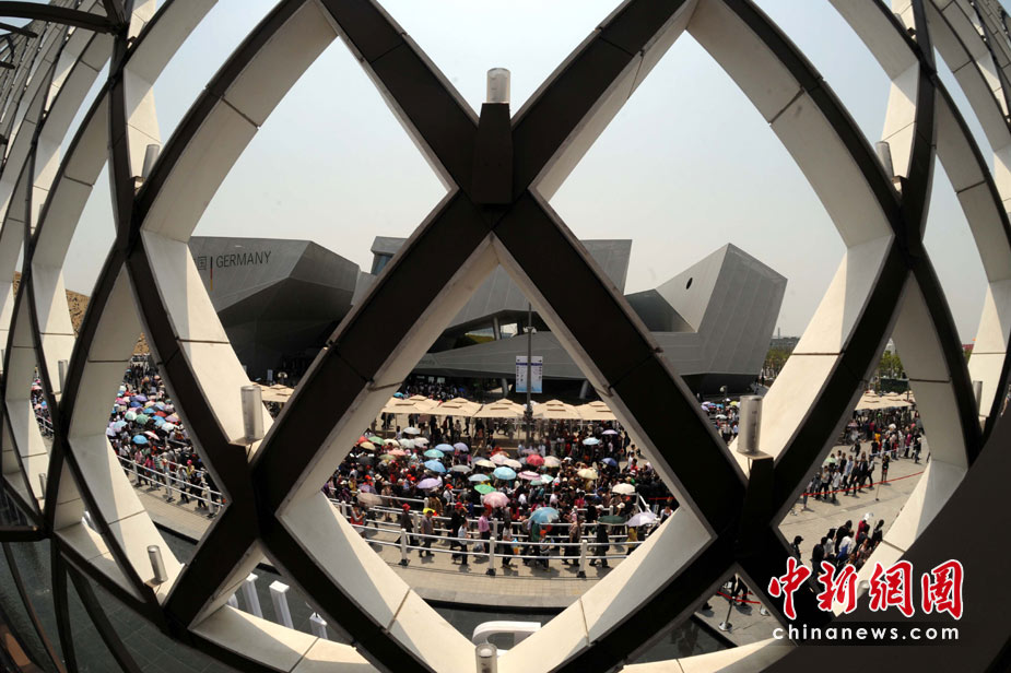 5月2日,上海世博园开园第二天迎来客流高峰。在正午的阳光下,从法国馆的艺术格栅中眺望德国馆,别有一番景观。 中新社发 廖攀 摄
