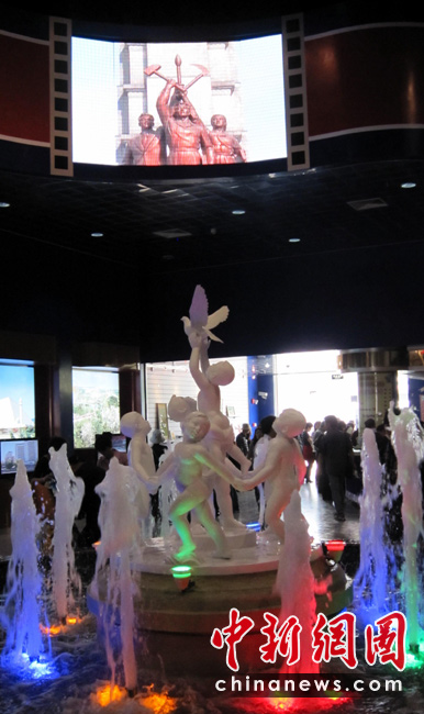 5月2日,上海世博会开园第二天,首次参展世博会的朝鲜馆迎来人潮。图为朝鲜馆内喷泉涌动,大屏幕上播放着介绍平壤主要景点的影片。中新社发 姜煜 摄