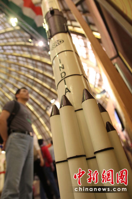5月2日,观众在上海世博会印度馆参观印度的“一箭十星”火箭模型。2008年4月,印度一举把10颗卫星送入轨道,这是世界首次“一箭十星”成功发射。中新社发 苏丹 摄