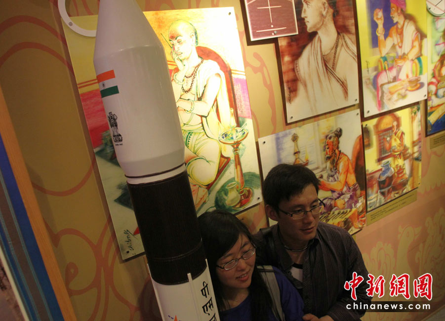 5月2日,观众在上海世博会印度馆参观印度的“一箭十星”火箭模型。中新社发 苏丹 摄
