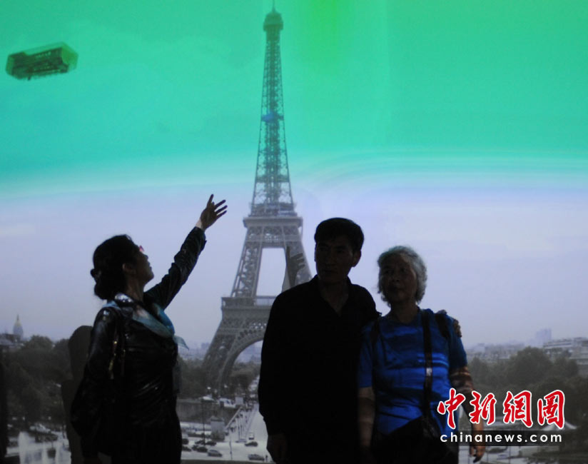 5月2日,上海世博园内,中国游客在法国馆亲密接触艾菲尔铁塔影像。中新社发 廖攀 摄