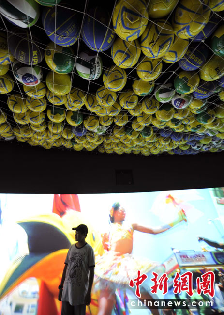 5月2日,上海世博园巴西馆,一个小观众在播放着桑巴热舞的环形屏幕前留影。这个放映厅的天花板是由几千个足球组成,尽显“桑巴王国”、“足球王国”的风采。 中新网记者 王红纲 摄