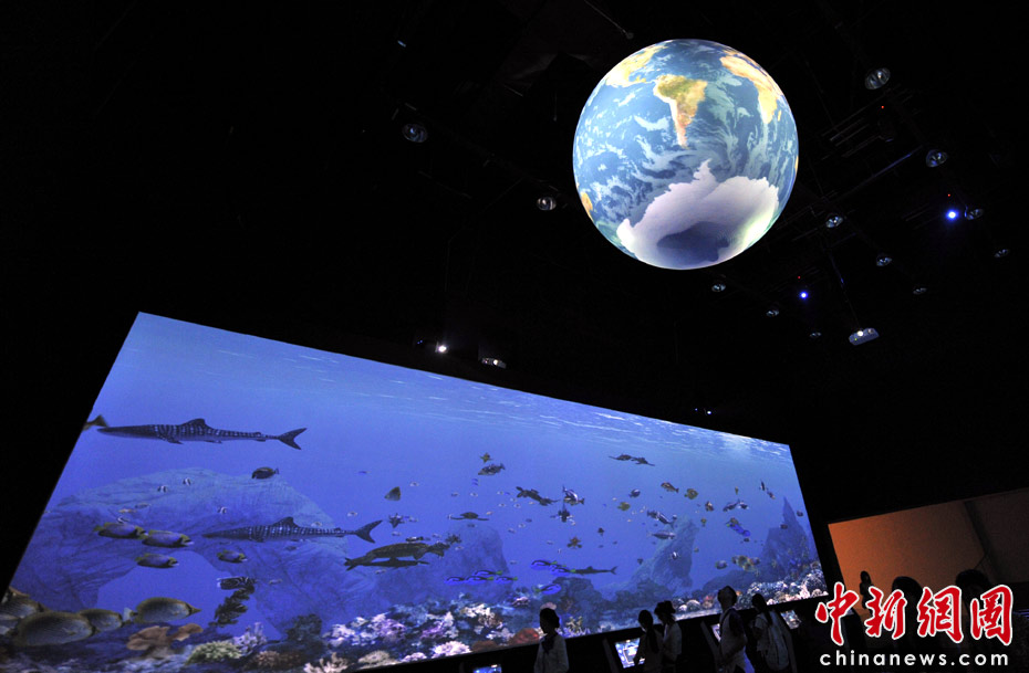“人与海洋的和谐共存”是2012年丽水世博会的口号,在该展区,游客可以通过电脑屏幕设计一条电子鱼,然后“放生”到大屏幕组成的“海洋”中进行水质监测,这些互动内容都引发游客极大的兴趣。中新网记者 王红纲 摄