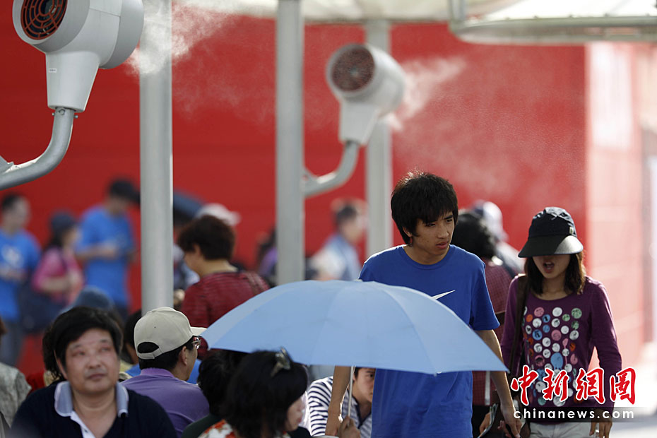 2010年5月2日,上海世博园区启动各项控温降温设施应对高温。图为游客休息区内启动喷雾降温系统。中新社记者 盛佳鹏 摄
