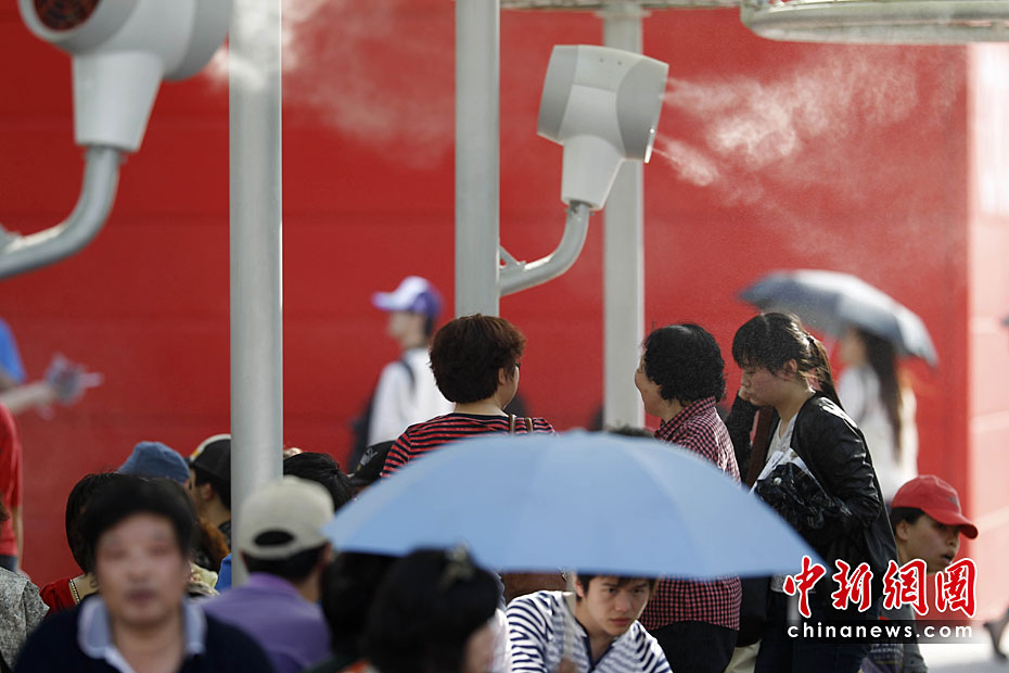 2010年5月2日,上海世博园区启动各项控温降温设施应对高温。图为游客休息区内启动喷雾降温系统。中新社记者 盛佳鹏 摄