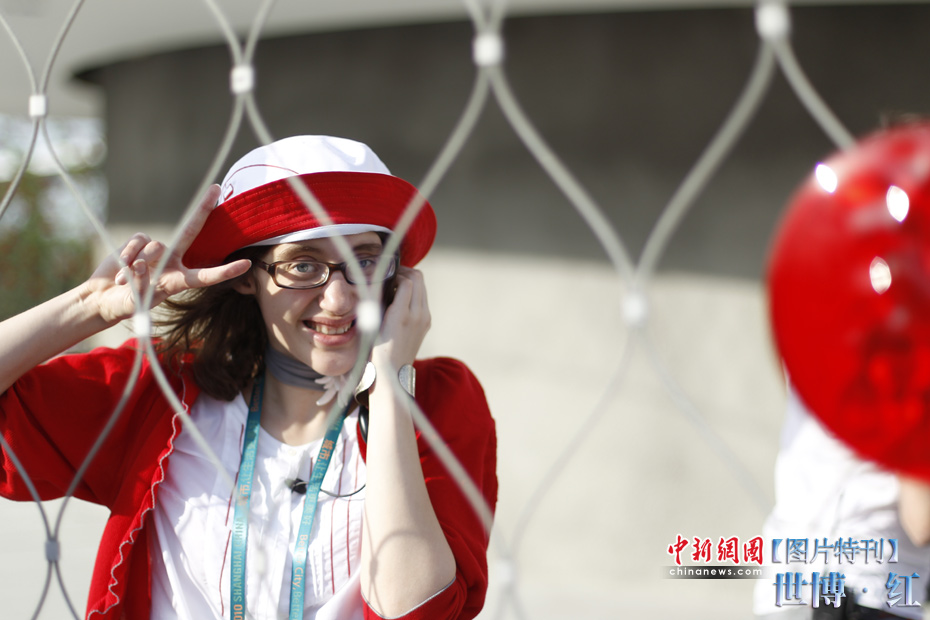 红色象征着热量与活力,红色也象征着兴奋与激情,在世博园区内游览,总会有一抹浓艳的红色闯入到记者镜头之中,让世博变得更加火辣。图为一位外国游客向面对镜头问好。中新社记者 盛佳鹏 摄