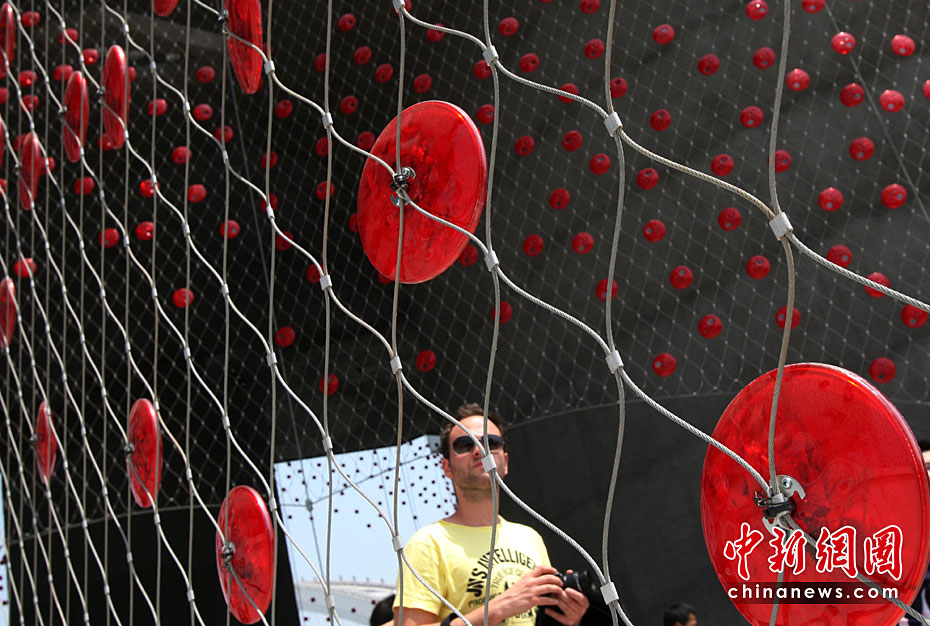 5月2日,上海世博会是第一个正式提出“低碳世博”理念的世博会,围绕着这样的理念,上海世博园区内的低碳元素比比皆是。图为瑞士馆用大豆纤维制成的红色幕帷,能发电,可天然降解。中新社发 汤彦俊 摄