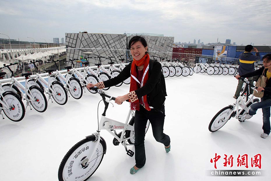 5月2日,上海世博会是第一个正式提出“低碳世博”理念的世博会,围绕着这样的理念,上海世博园区内的低碳元素比比皆是。图为游客在丹麦馆内享受自行车带来的乐趣。中新社发 汤彦俊 摄