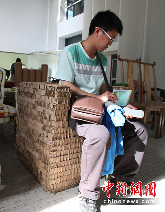 5月2日,上海世博会是第一个正式提出“低碳世博”理念的世博会,围绕着这样的理念,上海世博园区内的低碳元素比比皆是。图为世博伦敦零碳馆内由废旧纸箱做成的沙发。中新社发 汤彦俊 摄