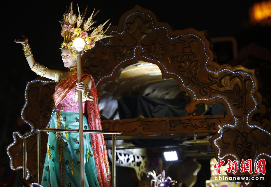5月2日晚,由一辆辆充满异域风情的花车和身着盛装的表演者组成的“欢乐盛装大巡游”在世博园区举行。中新网记者 盛佳鹏 摄