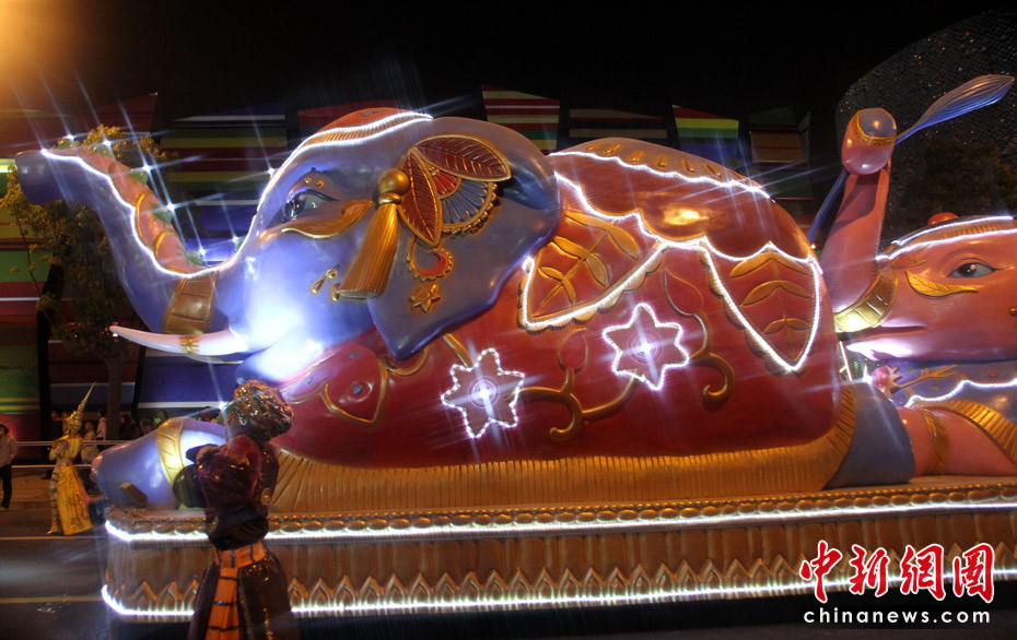 5月2日晚,由一辆辆充满异域风情的花车和身着盛装的表演者组成的“欢乐盛装大巡游”在世博园区举行。中新网记者 苏丹 摄