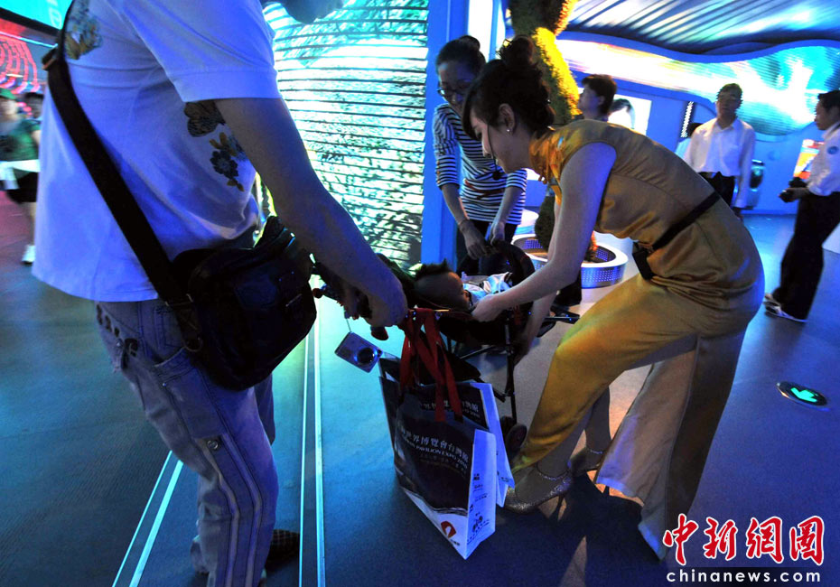 5月3日,上海世博会中国山东馆一位礼仪小姐始终笑容可掬,许多参观者都喜欢与外秀内慧的她拍一张留影照。当一对夫妇推着婴儿车经过时,她迅速上前帮助抬下阶梯。她因而享有全场最善解人意的礼仪小姐美称。中新社发 贾国荣 摄