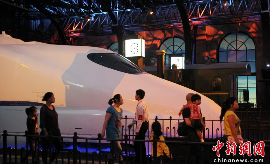 观众在上海世博会“城市生命馆”参观动车组模型。中国近年在动车交通方面发展迅速。设计师到世界各地考察后认为,一个城市只要通了火车,就开始有活力,成为城市发展的命脉。中新社发 苏丹 摄