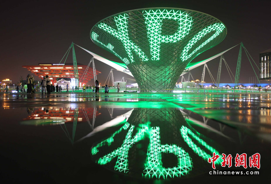夜幕下的上海世博园区处处流露光华与璀璨,世博轴上的“阳光谷”成为一个个流光溢彩的“夜光杯”,以不同色调交织成流动的光影旋律,给游客们带来难以忘怀的感受。图为世博轴“阳光谷”与中国馆的灯光交相辉映,“阳光谷”上打出世博会的英文简称。中新社发 宗金柱 摄