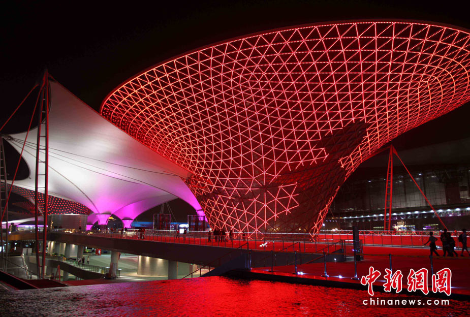 夜幕下的上海世博园区处处流露光华与璀璨,世博轴上的“阳光谷”成为一个个流光溢彩的“夜光杯”,以不同色调交织成流动的光影旋律,给游客们带来难以忘怀的感受。中新社发 宗金柱 摄