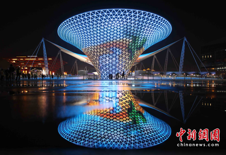 夜幕下的上海世博园区处处流露光华与璀璨,世博轴上的“阳光谷”成为一个个流光溢彩的“夜光杯”,以不同色调交织成流动的光影旋律,给游客们带来难以忘怀的感受。中新社发 宗金柱 摄