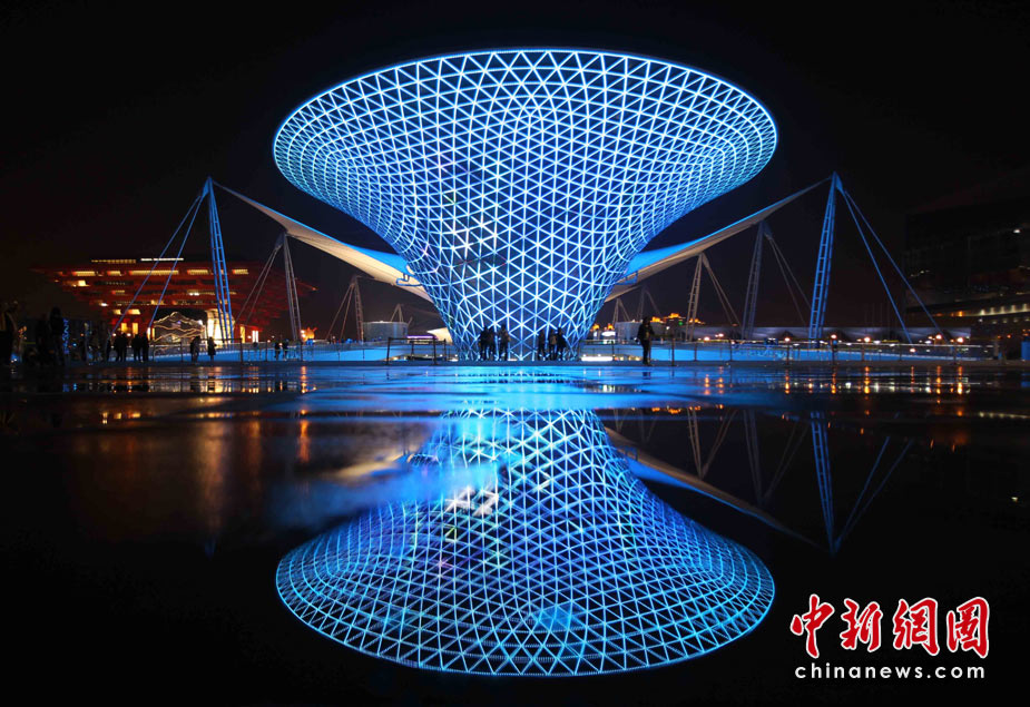 夜幕下的上海世博园区处处流露光华与璀璨,世博轴上的“阳光谷”成为一个个流光溢彩的“夜光杯”,以不同色调交织成流动的光影旋律,给游客们带来难以忘怀的感受。 中新社发 宗金柱 摄
