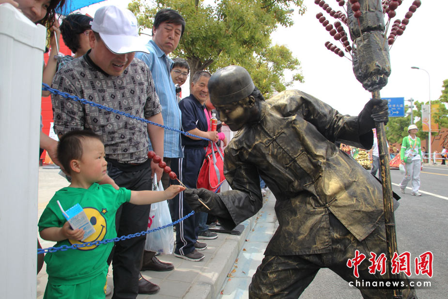 5月4日,上海世博会北京周花车巡游演员与观众互动。当日,世博会北京周开幕。中新社发 苏丹 摄