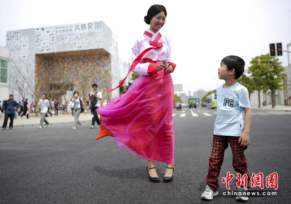 5月4日,上海世博园韩国馆外,一位男孩巧遇穿着美丽朝鲜服装的女士。中新社发 廖攀 摄
