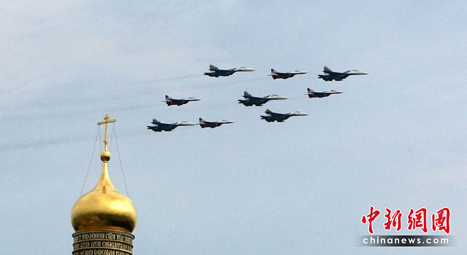 当地时间5月4日,在俄罗斯首都莫斯科,参加彩排的战机编队飞过红场上空。俄罗斯将于5月9日隆重纪念卫国战争胜利65周年。图片来源:中国新闻网