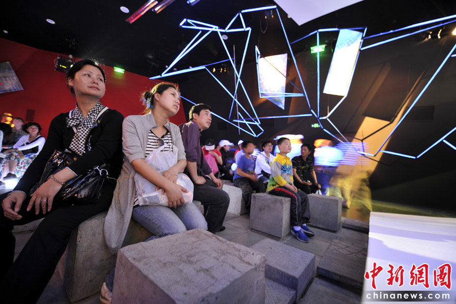 观众在观看模拟演出,做的不是椅子,是一个个“石凳”,感觉就像是在广场上。中新网记者 王红纲 摄