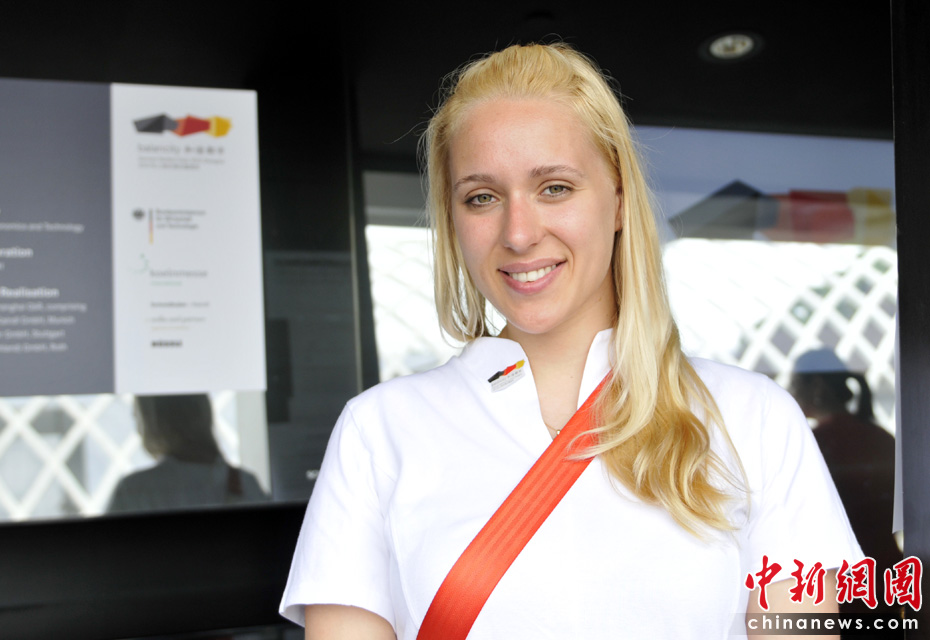 美丽的德国馆工作人员,她们都能用一些简单的汉语与中国游客交流。中新网记者 王红纲 摄