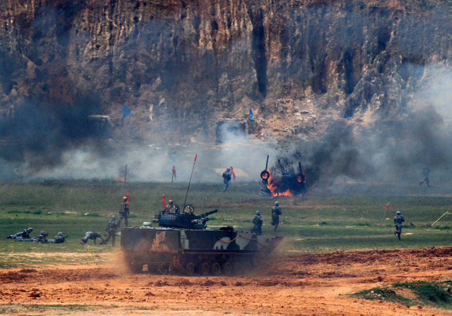 陆战队在训练场进行登陆作战实兵实弹演练。图片来源:新华网 查春明摄