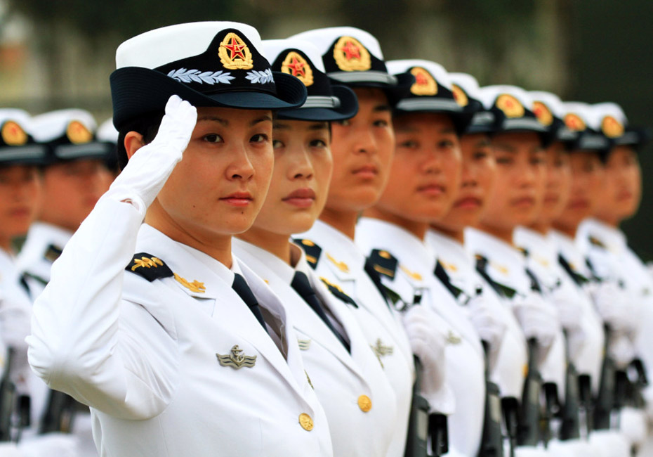5月5日,海军陆战队女队员接受检阅。图片来源:新华网 查春明摄
