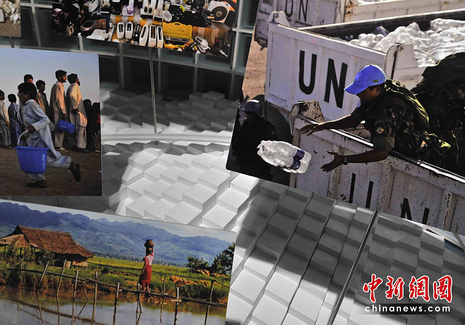 一所蓝色的简朴平房,在5月开园的上海世博会大道边上,极不显眼。但是,联合国联合馆的鲜明会标,特别吸引人。这个展馆集中了世界卫生组织、世界银行和联合国的儿童基金会、粮农组织、教科文组织等22个机构。图片来源:中国新闻网 贾国荣 摄