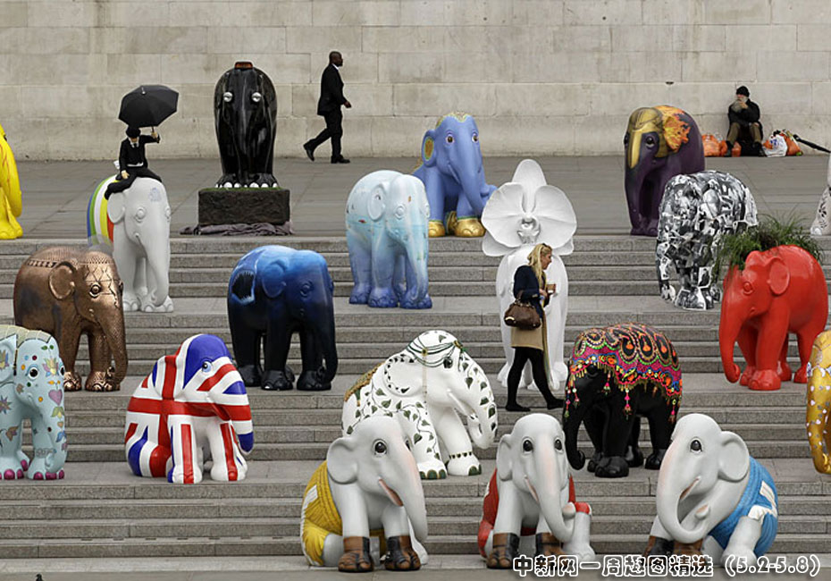 5月4日,2010年伦敦大象游行活动当日在特拉法尔加广场启动。260个真象大小的彩绘雕塑将在伦敦各处展出,并将于6月30日拍卖为慈善组织筹款。图片来源:中国新闻网>>点击观看详细内容