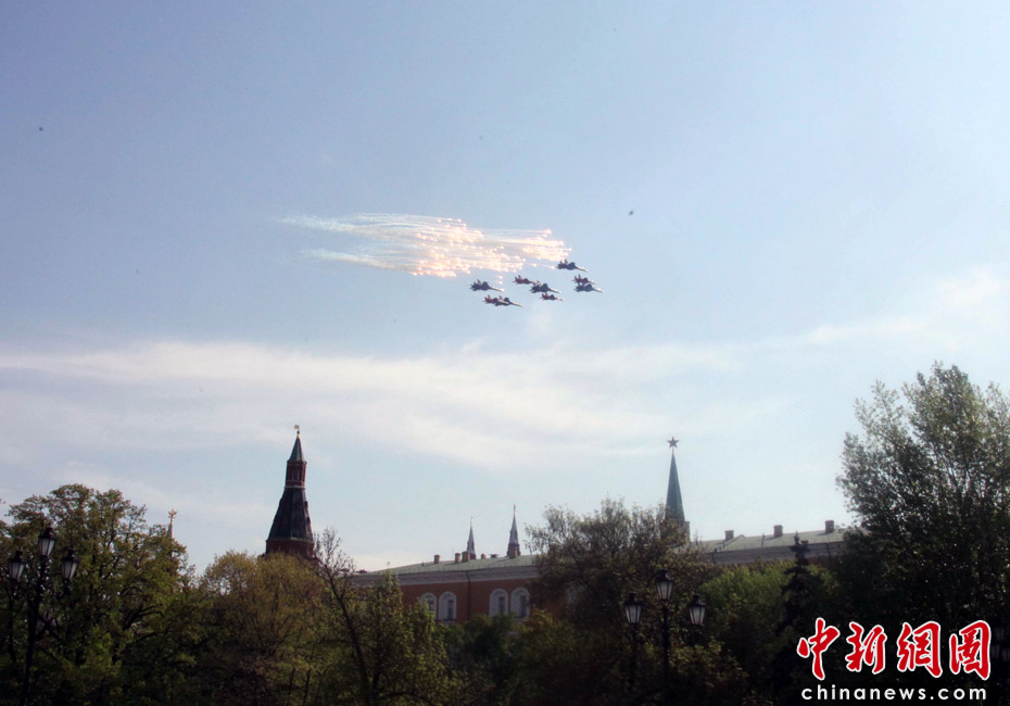 5月9日,俄罗斯在莫斯科红场举行盛大的阅兵式,庆祝卫国战争胜利65周年。莫斯科时间5月9日上午10点(北京时间9日下午2点)许,阅兵式正式开始。图为空中梯队飞越红场上空。中新网记者 张朔 摄