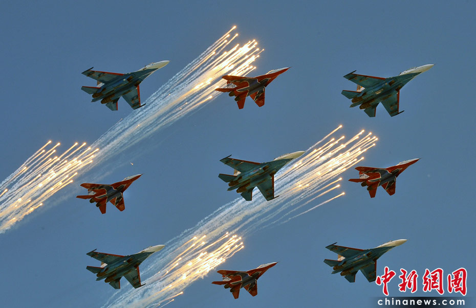 5月9日,俄罗斯在莫斯科红场举行盛大的阅兵式,庆祝卫国战争胜利65周年。莫斯科时间5月9日上午10点(北京时间9日下午2点)许,阅兵式正式开始。图为空中梯队飞越红场上空。