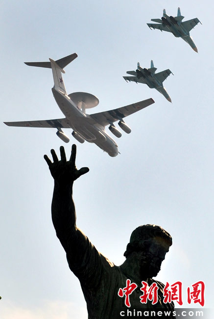 5月9日,俄罗斯在莫斯科红场举行盛大的阅兵式,庆祝卫国战争胜利65周年。莫斯科时间5月9日上午10点(北京时间9日下午2点)许,阅兵式正式开始。图为空中梯队飞越红场上空。
