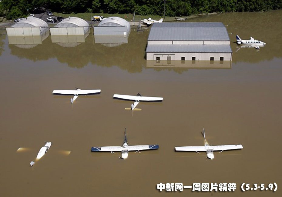 5月4日周二,在美国田纳西州纳什维尔,科尼利亚堡飞机场的飞机浸泡在洪水里。周末的暴雨令坎伯兰河泛滥,田纳西泰坦也变成了一片汪洋。