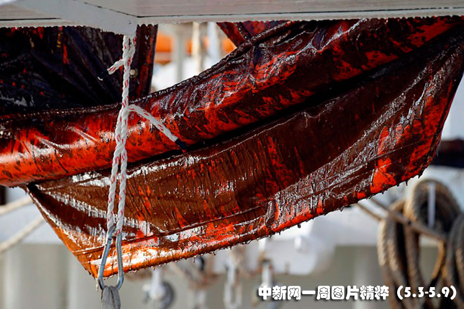5月6日周四,在路易斯安那州Breton Sound,被石油浸过的帆挂在一艘捕虾船上。工人们周四打算将一个100吨的钢筋水泥罩放入海底,希望以此封堵墨西哥湾油井的大部分石油泄漏。