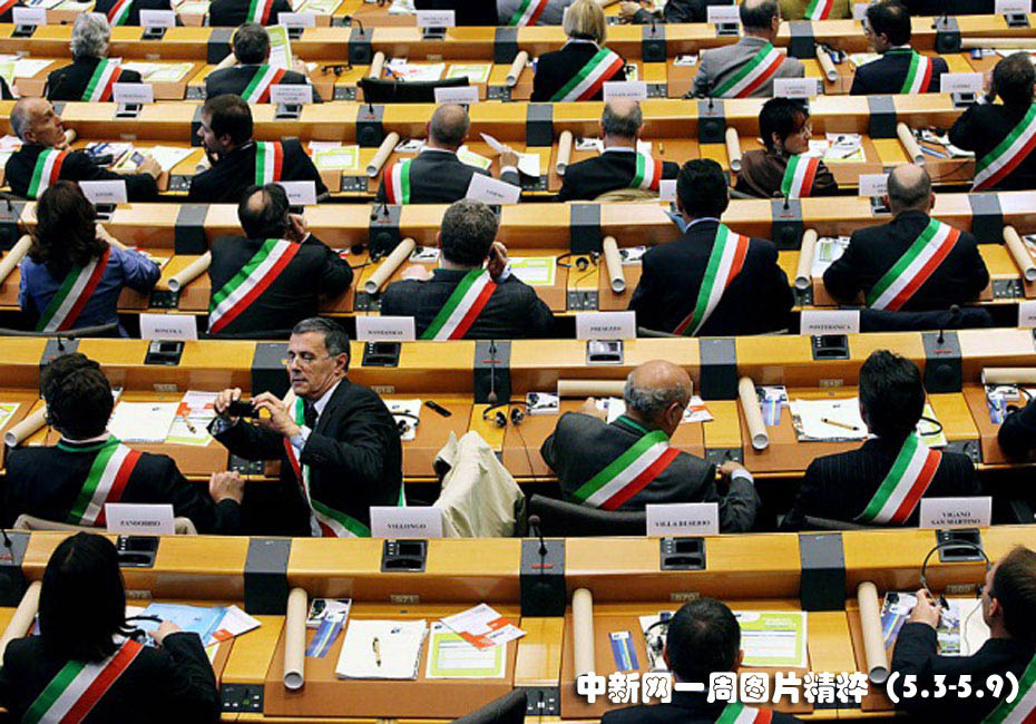 5月4日周二,在布鲁塞尔召开的欧洲议会市长会议上,一名市长为同事们拍照。