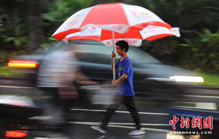 未来三天,青藏高原中东部、西南地区、江汉、江淮、江南、华南等地将持续阴雨天气,其中,广西南部、广东大部、江西南部、福建南部、海南西北部、湖北大部、湖南北部、重庆大部等地有大雨或暴雨,局地有大暴雨。图为5月9日傍晚,佛山市禅城区文华北路,一位市民撑着一个大伞过马路。崔景印摄(CFP)